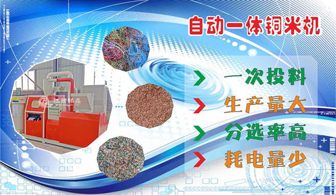 全自動銅米機(jī)是專業(yè)干式分離廢舊電線電纜的生產(chǎn)線。例如:舊汽車電路線,通訊電纜線,以及剝線機(jī)不適合加工(各種民用電線)廢舊雜料電線.毛絲細(xì)線等.此機(jī)的特點(diǎn)是大小線不用分類可以同時破碎分離,結(jié)構(gòu)新型,生產(chǎn)量大,耗電少。分選率高,一次投料,多機(jī)協(xié)作完成。全線由PLC控制,在國內(nèi)處于領(lǐng)先水平。該機(jī)的開發(fā)成功,即解決了焚燒取銅方法中出現(xiàn)的問題,又能提高回收銅的質(zhì)量,并可將塑料回收利用,同時解決環(huán)境的污染。